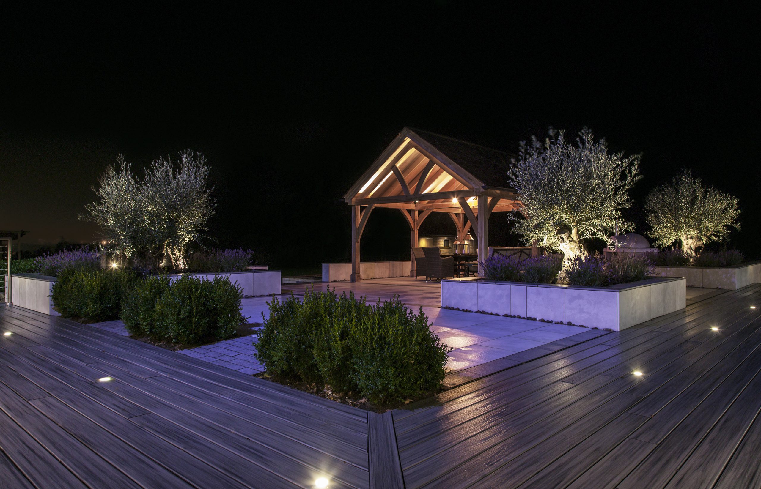A garden lighting project in Castor featuring Collingwood and Astro fixtures. The design provides professional illumination for both the landscape and the car collection.